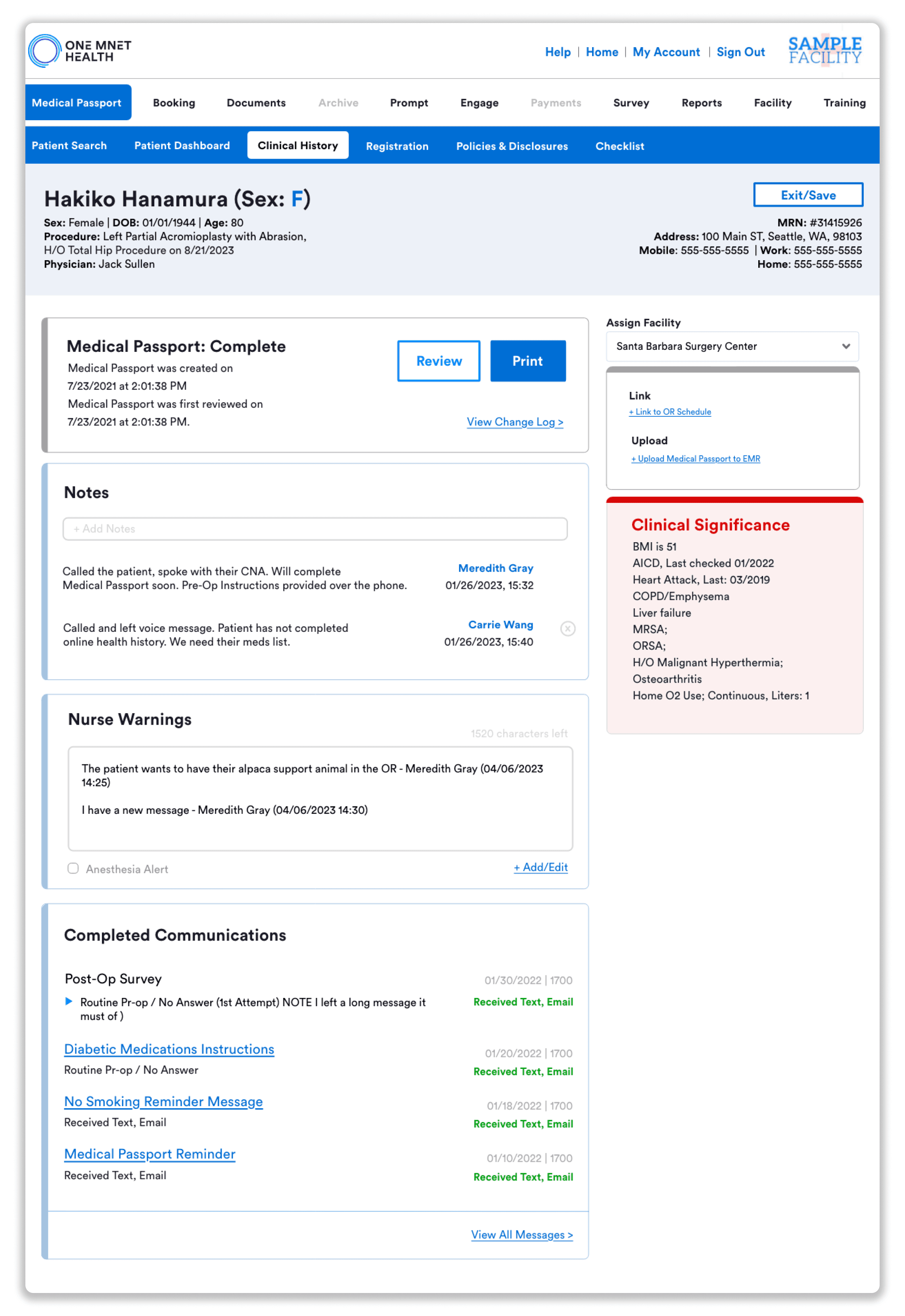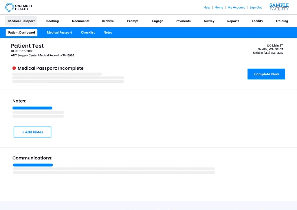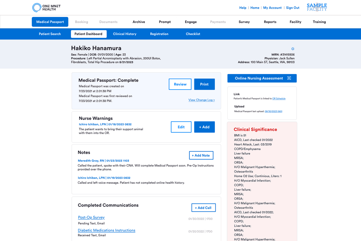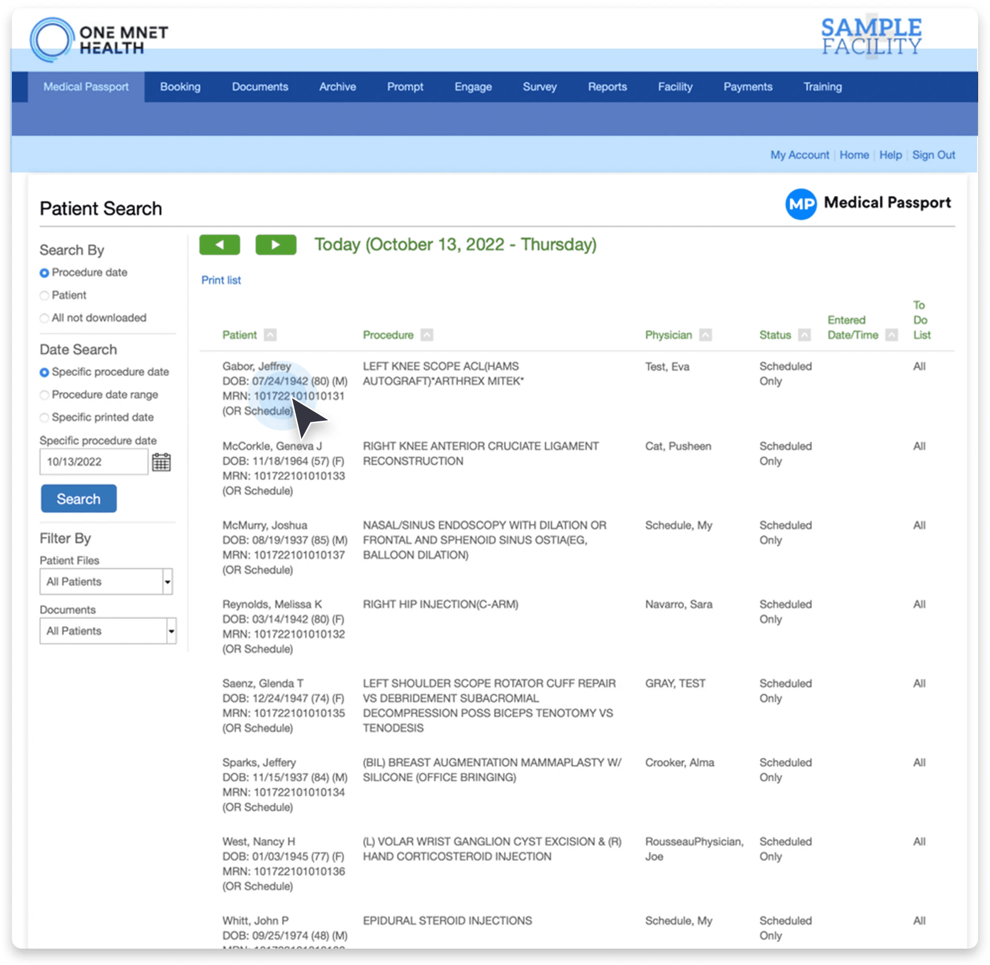 Surgery centers use One Mnet Health’s SaaS platform, acquired from One Medical Passport, to streamline pre-op and post-op care. Patients submit their health histories and pre-op assessments via our portal, which then provides their information directly to the surgery centers for review.