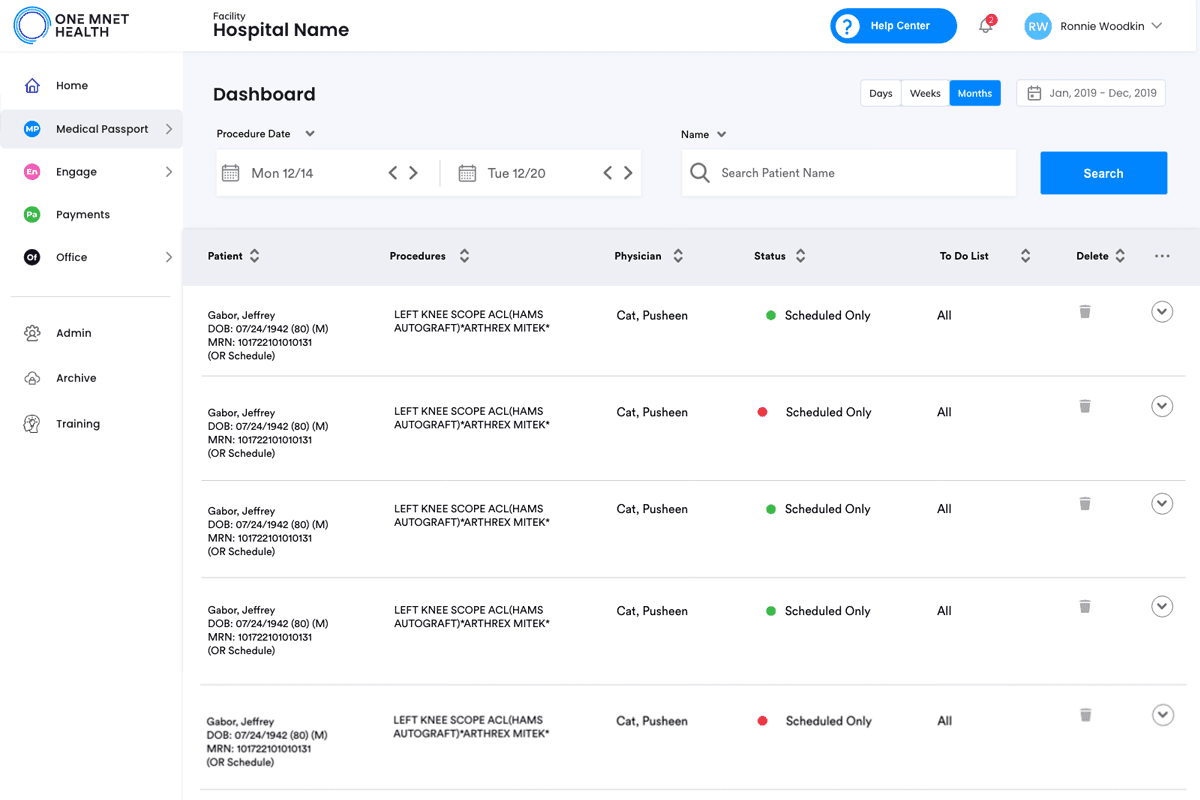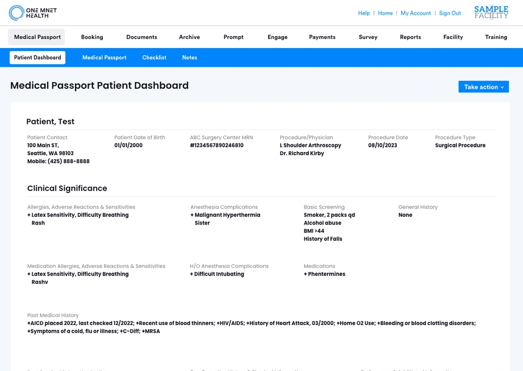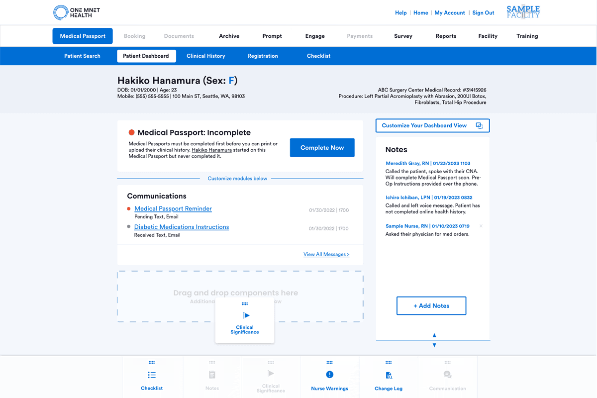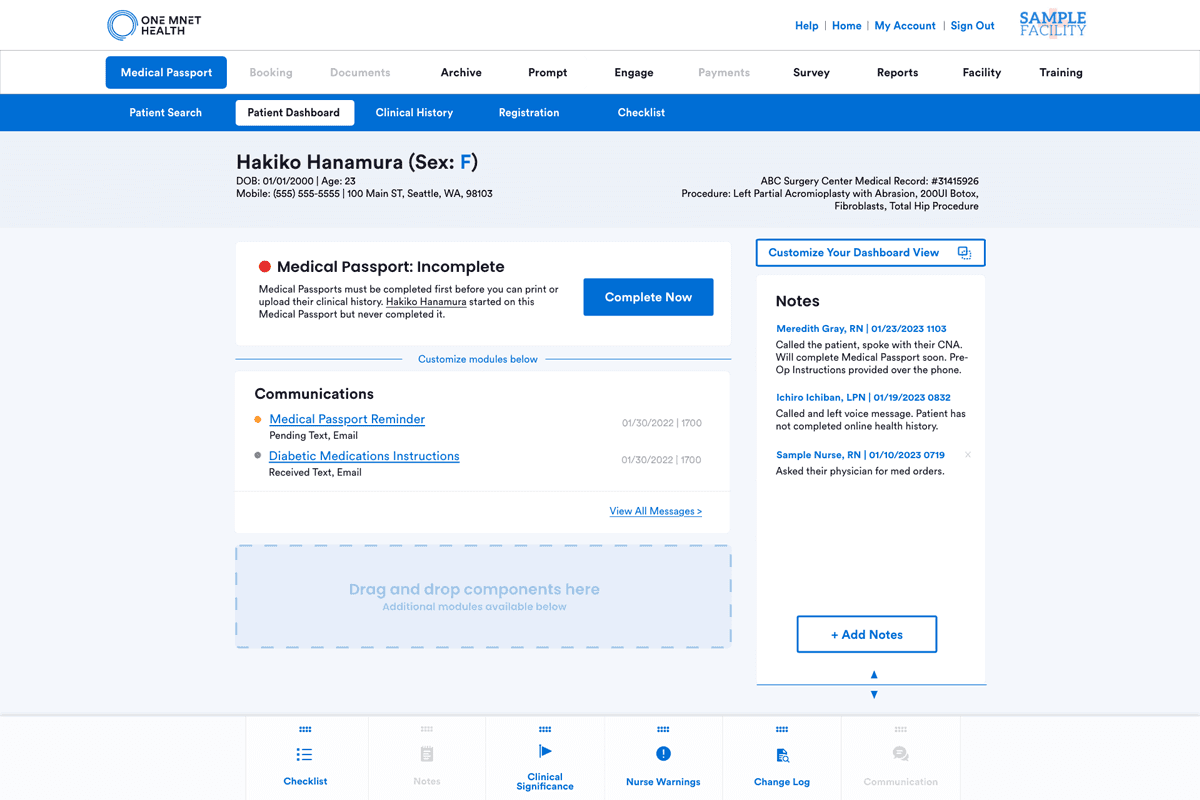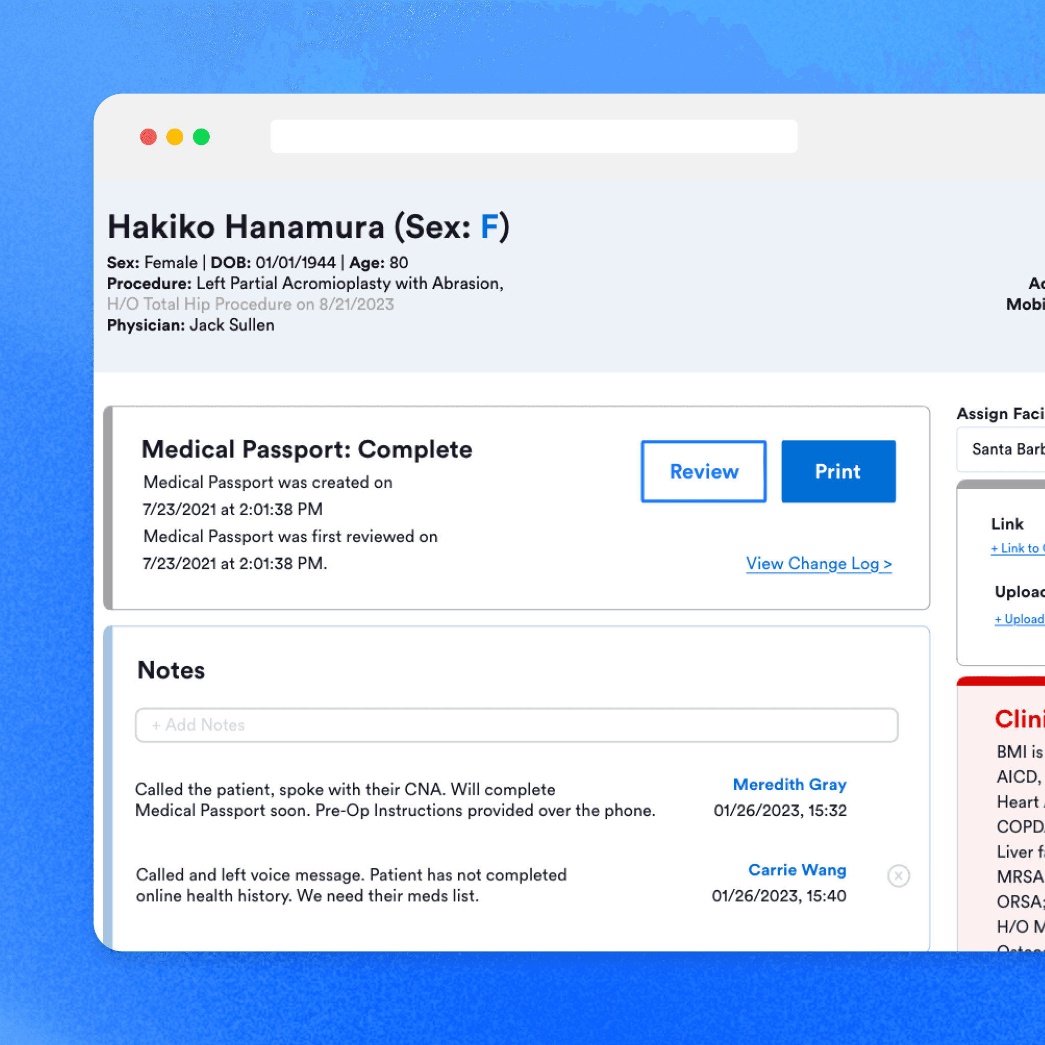 Surgery centers use One Mnet Health’s SaaS platform, acquired from One Medical Passport, to streamline pre-op and post-op care. Patients submit their health histories and pre-op assessments via our portal, which then provides their information directly to the surgery centers for review.