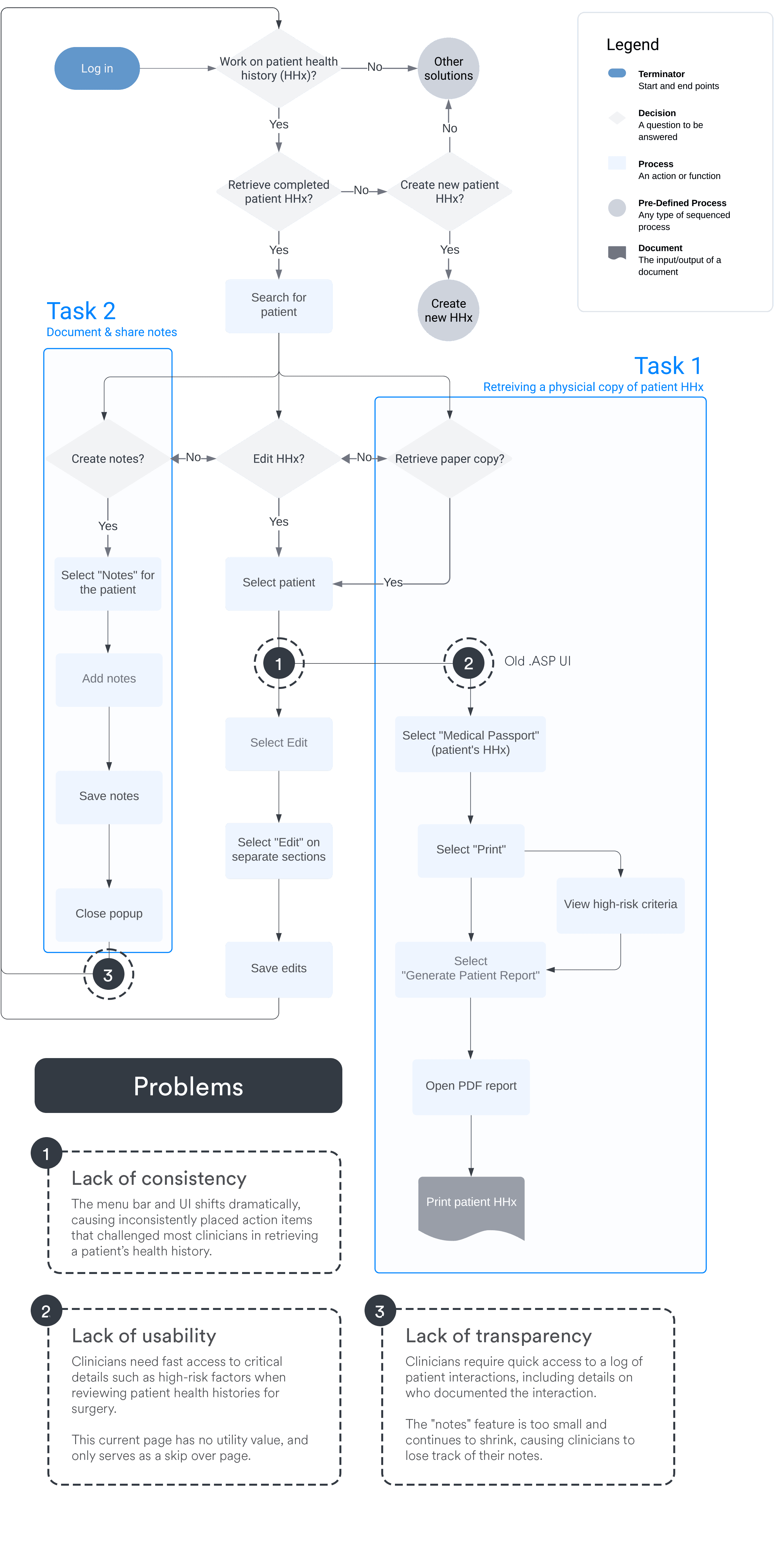 I conducted a legacy user flow analysis to understand the most common actions of our users. Within this analysis, I identified two main tasks crucial to their day-to-day workflow:
