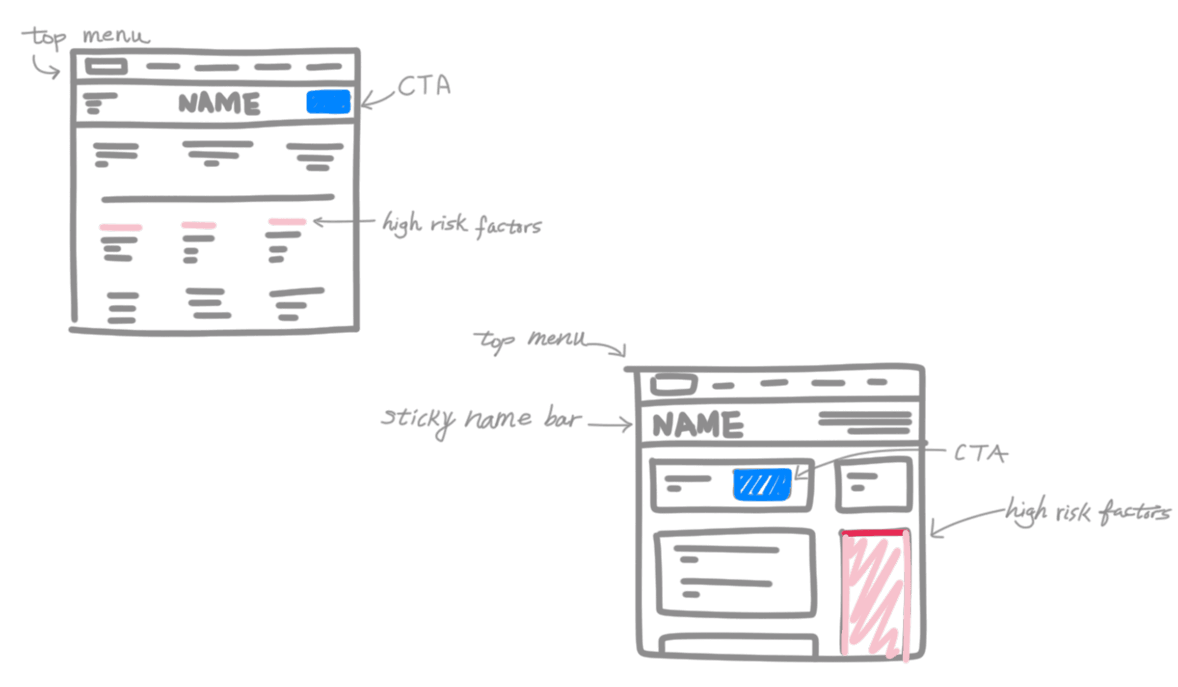 I went with the bento box layout to condense crucial information on a single page. This streamlined clinician's workflow by focusing on essential tasks of accessing patient health history, view risk factors, and manage notes.